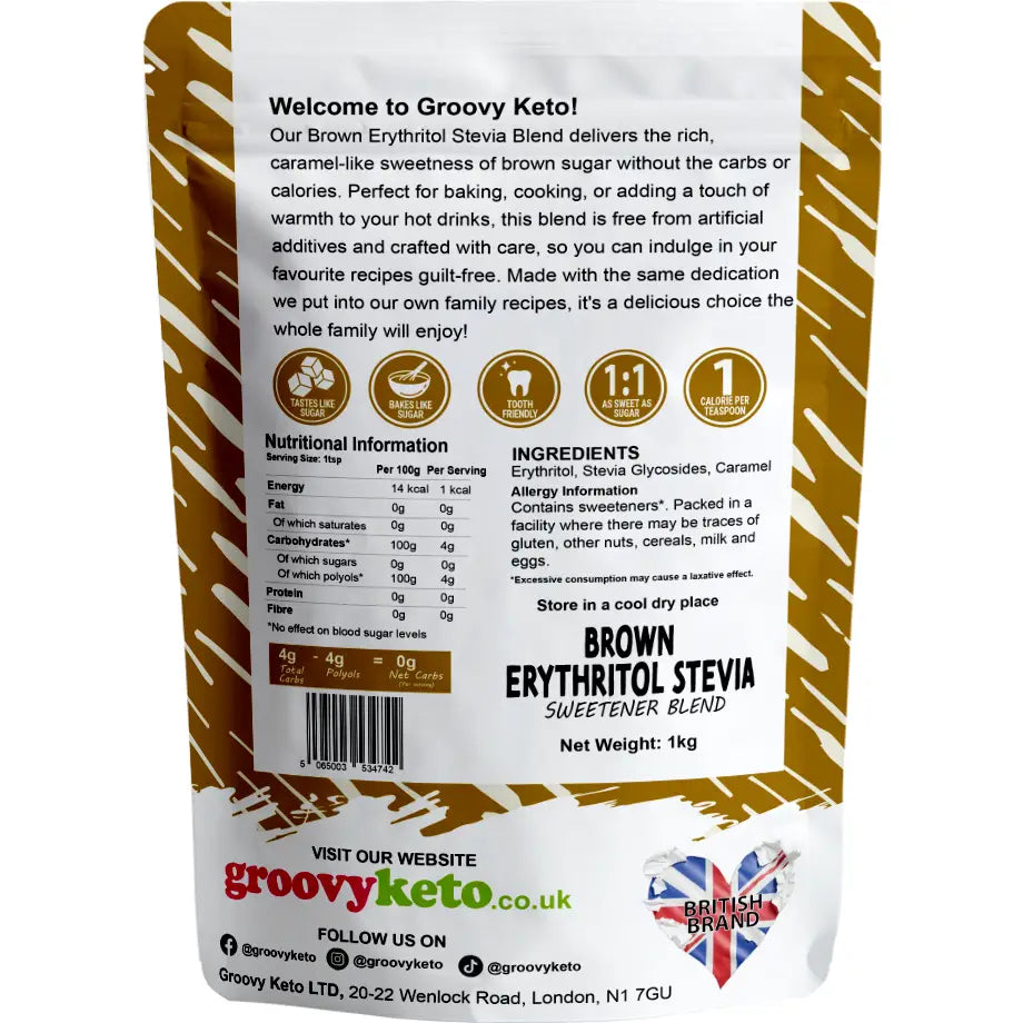 Groovy Keto Brown Erythritol is the perfect sugar-free alternative to brown sugar. With its soft texture, natural golden colour and rich, caramel flavour, it’s ideal for baking cookies, brownies, sauces and more — all without the sugar, carbs or calories.