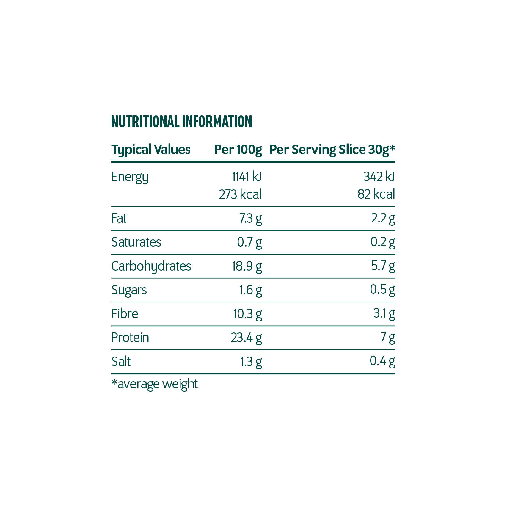 | Typical values | Per 100g | Per 23g (per slice) |